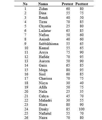 Peneliti telah memberikan perlakuan terhadap siswa, dan didapatkan data sebelum dan sesudah perlakuan, dengan data sebagai berikut:
