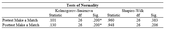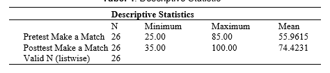 Dari tabel diatas hasil test dari 26 responden dapat dilihat bahwa nilai tertinggi pretest adalah 85 dan nilai terendah 25. Dengan data yang sudah diperoleh nilai rata-rata nilai pretest sebesar 55.96, kemudian nilai rata-rata posttest naik menjadi 74.42. Ini menunjukkan adanya efektivitas peningkatan penguasaan kosa kata Bahasa arab siswa dengan penerapan metode make a match.