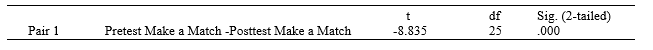 Untuk mengetahui apakah terdapat perbedaan penguasaan kosa kata siswa sebelum dan sesudah penerapan metode make a match, dilakukan uji data menggunakan uji Paired Sample T Test, tujuan dari uji ini untuk mengetahui apakah data yang di uji memiliki hubungan atau pengaruh dengan membandingkan dua mean yang saling berhubungan sebelum dan sesudah diberikan perlakuan. Kriteria pengujian dengan nilai sig. (2-tailed) < 0.05 dinyatakan memiliki hubungan antara pretest dan posttest.