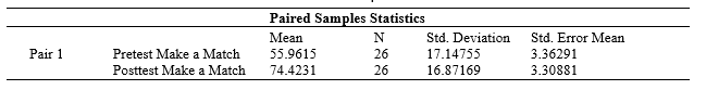 Dengan tabel di atas, dapat diamati bahwa ada peningkatan mean antara pretest dan posttest yang menunjukkan adanya pengaruh dari metode Make a Match terhadap terhadap penguasaan kosakata siswa kelas x di SMA Muhammadiyah 3 Tulangan.
