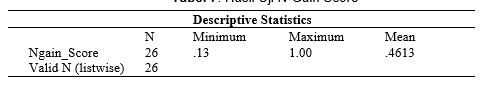 Uji N-gain score digunakan untuk mengukur efektifitas pembelajaran dengan membandingkan nilai belajar ketika menggunakan dan tanpa metode pembelajaran[18].