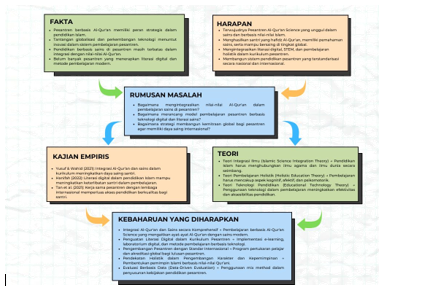 a) Studi Literatur: mengumpulkan referensi dari jurnal, buku, dan regulasi terkait pengembangan pesantren berbasis Al-Qur'an dan sains.